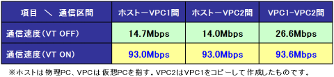 VT ONの場合は、ホスト-VPC間、VPC同士間のどちらでも、約93Mbpsとなりました。転送速度が速くなり、ボトルネックになる要因が変わったのだと思われます。サーバーで仮想化する場合は非常に有用だと思います。