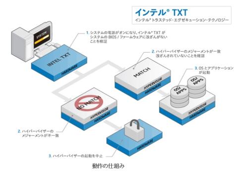 インテル® トラステッド・エグゼキューション・テクノロジー (インテル® TXT) は、システムの起動時にサーバーまたは PC を構成する主要なコンポーネントの動作状態を検証することで、ソフトウェア・ベースの悪意ある攻撃から IT インフラストラクチャーを保護するハードウェア・セキュリティー・ソリューションです。