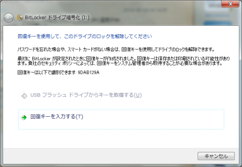 上記で保存した回復キーを入力すれば、OSを起動出来ます。