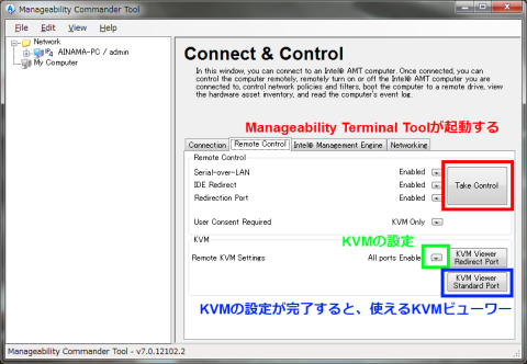 5.まずは、Manageability Terminal Toolを起動してみましょう。これだけでも、電源のON/OFFは出来ます。でも、画面が見えませんけどね(汗)