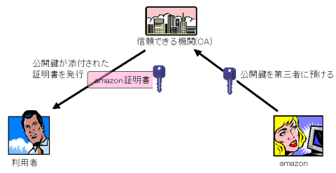 信頼のおける第三者機関は、amazonの公開鍵であることを保証する証明書と一緒に、公開鍵を利用者側に配布します。