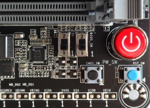 ほかに、マザーボード上に、電源ボタンや、リセットスイッチ,C-MOSクリアスイッチが配置され、オーバークロックする際に便利な当に、テスターのヘッダーも配置されています。
