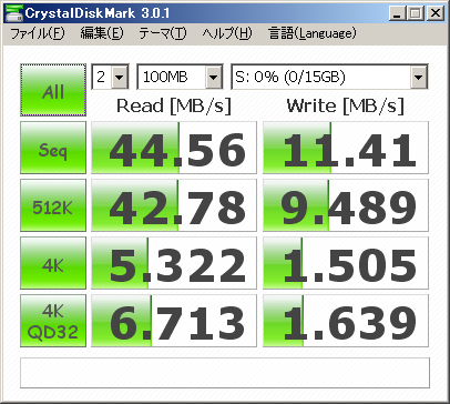 とりあえずベンチマークの値を掲載しておきます。測定環境は、ASUS P6X58D-EのオンボードUSB3.0対応コネクターに、USB3.0対応ハブELECOM U3H-S410SWHを接続し、そこにUSB3.0対応カードリーダー・ライターであるSilicon Power SPC39V1Wを繋いだものです。
