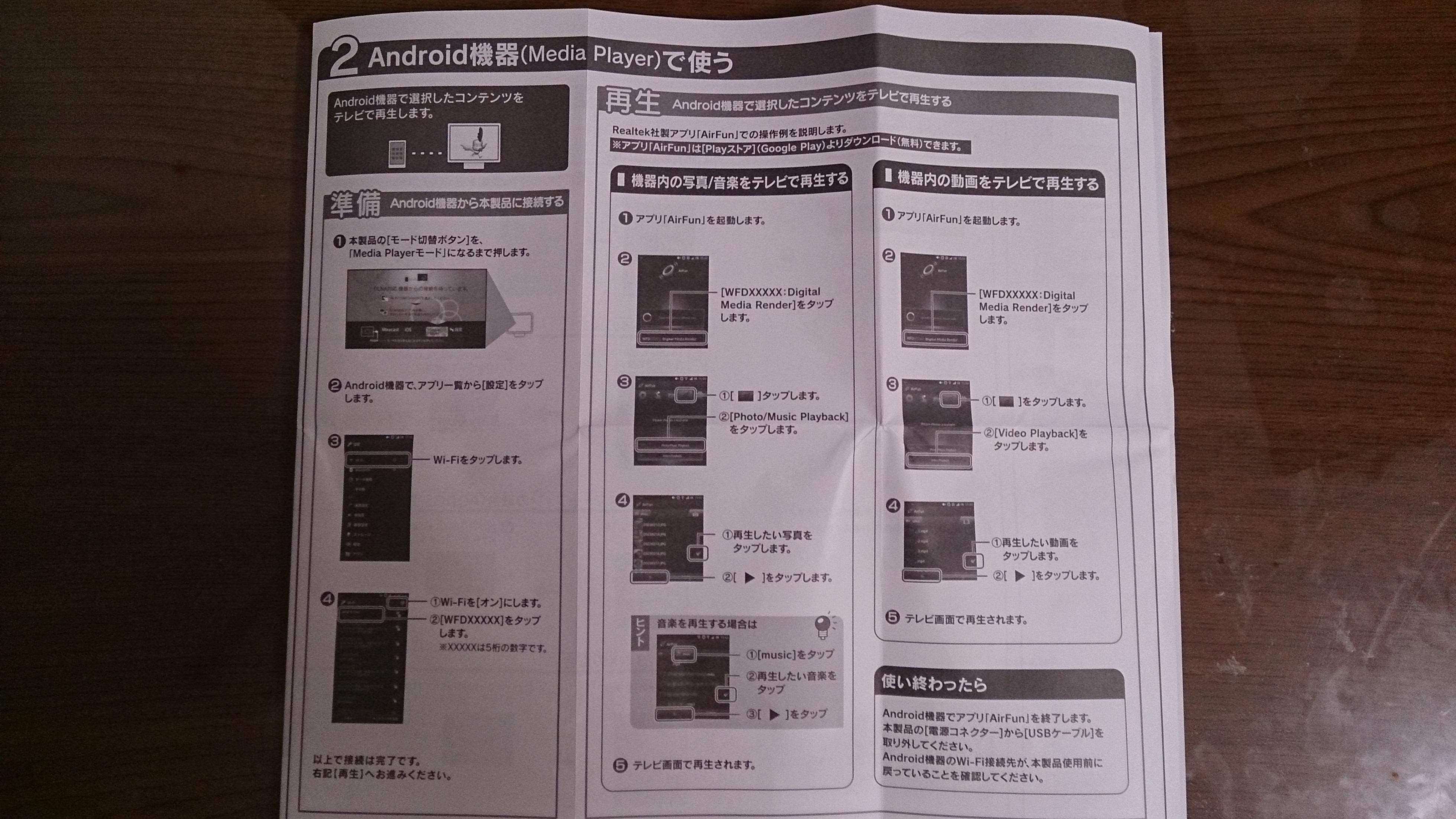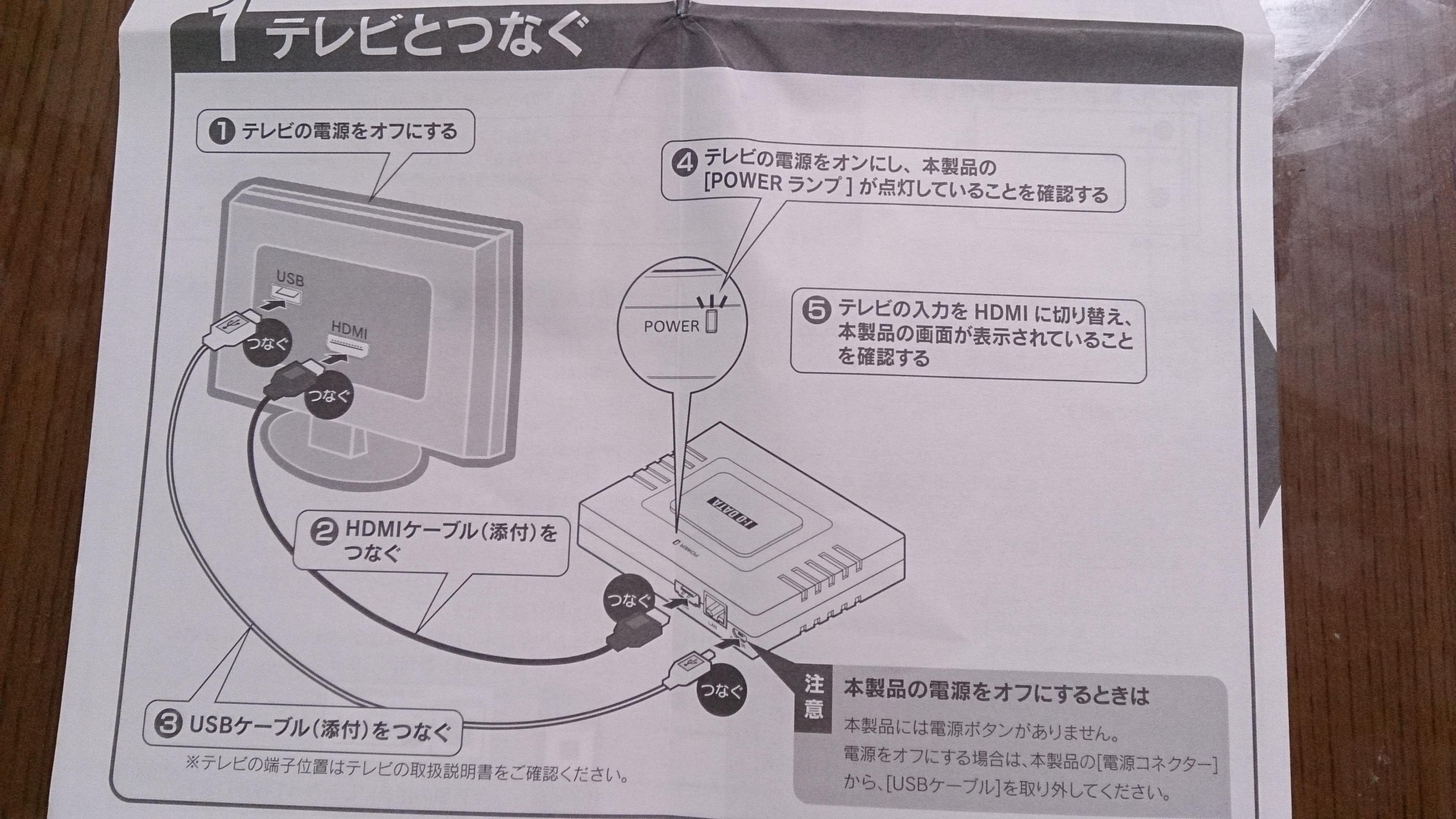 アダプター本体に付属のHDMIケーブル(出力用)を差し,USBケーブル(電源供給用)をテレビに差そうと思ったら,自宅のテレビにはUSBポートがなかったので,焦って説明書をよくみたところACアダプターからの供給について記述があった。