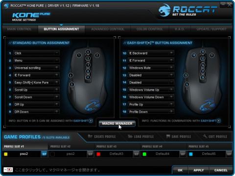 2013/08/08:マウスに設定してある各プロファイルのデータは、マウスに記憶されているようです。pso2が緊急メンテのため(w)、デスクトップ1台、ノート3台で確かめたところ、