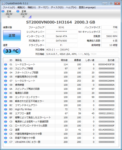 回転数は5900rpmと今時のHDDに比べると控えめ。