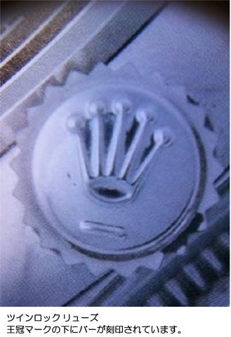 ロレックスが高度な技術を使い、レーザーで小さく彫られた透かしの王冠マークが風防ガラスの6時の位置にあります。2004年以降製造の全モデルにレーザー刻印がはいっているようです。これは偽物防止の為だそうですが、偽物にもこの刻印はあるようです。(偽物の場合は、はっきり確認できるらしい)