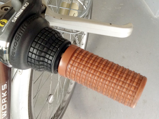 少し前にタイヤも黒に交換し、今回グリップも交換して茶色い部分が減ってきました。サドルは焦げ茶色ですが、ペダルが茶色いので全体的にちょっと怪しい感じになってしまいました。こうなったら見た目だけの為にペダルも黒にしようかなぁ、と思ったり思わなかったりw
