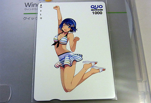 しかしこれ、店舗限定の特典ではなくいくつかの店舗で展開されており、知る限り初出のQUOカードなので新規作成っぽい(同じ水着絵のQUOカードはドスパラが以前作っていたが、そちらは背景とドスパラロゴがあり、額面も異なる)。