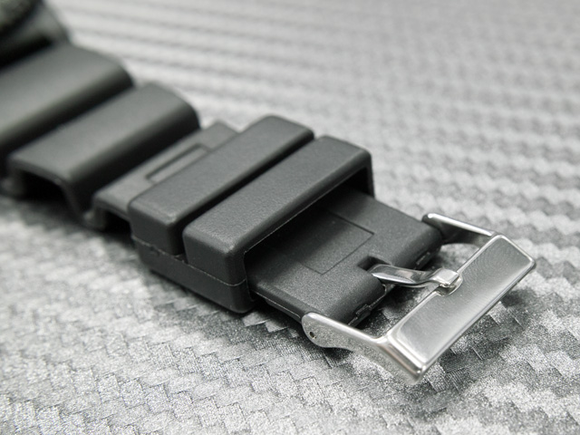 以前のフラットなイメージからゴツゴツしたダイバーズウォッチっぽいイメージに変わり、今の季節(8月)にちょうど良い感じになりました。色はブラックですが、色合いと艶消し具合が時計本体と調和していて全く違和感のない組み合わせになっていると思います。