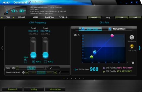 標準ではインストールされませんが、OC&モニタリングツールのMSI Command Centerです。デザインが良いですね。どのタブを開いていてもCPU温度が見えるのがありがたいです。