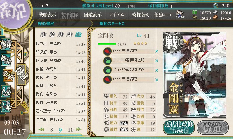うちは霧島様が Lv52、Miss.金剛が Lv50 になりました。榛名もそろそろ30。