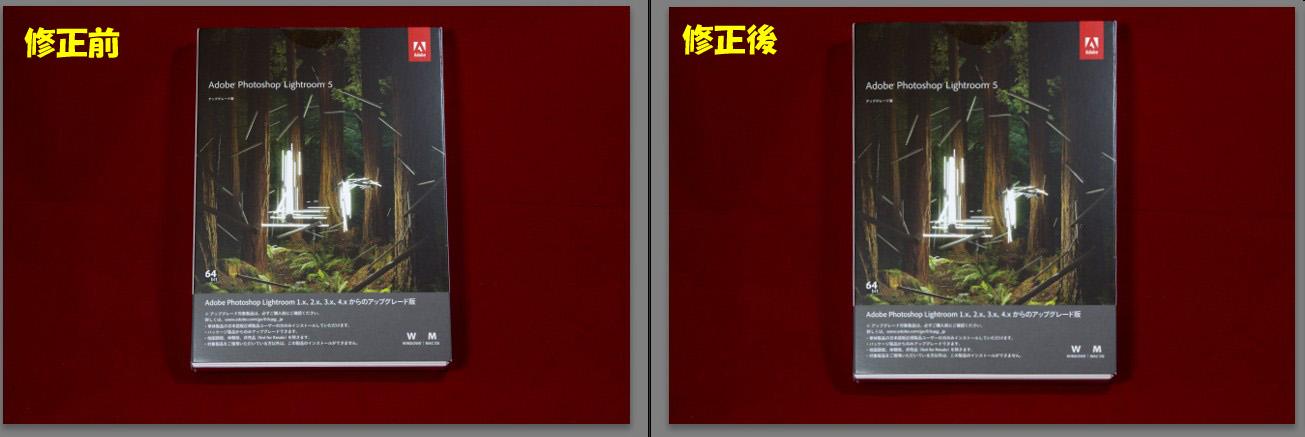 修正前はパッケージの上方がレンズより遠いため細目に写ってしまっていますが、自然に四角くゆがみが修正されました。