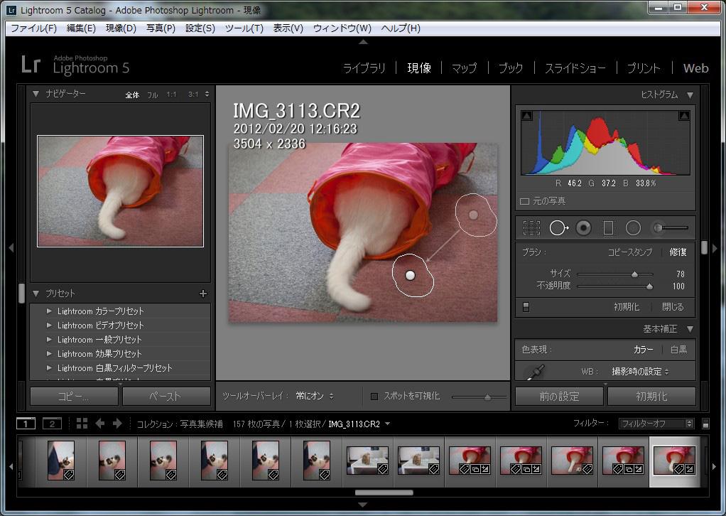 そして新機能というより機能強化された「高度な修復ブラシ」ですが、Lightroom 4まではスポット修復ブラシという名前で円形の修復範囲しか選べませんでしたが、消したい対象物をなぞるだけで消し去ることが出来ます。