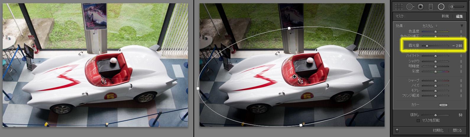 円形フィルターを使うことで露光量や彩度などを指定した領域に対し放射状に適用することが出来ます。