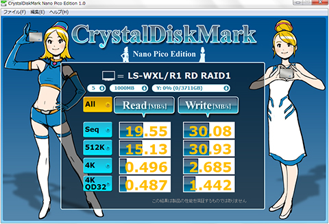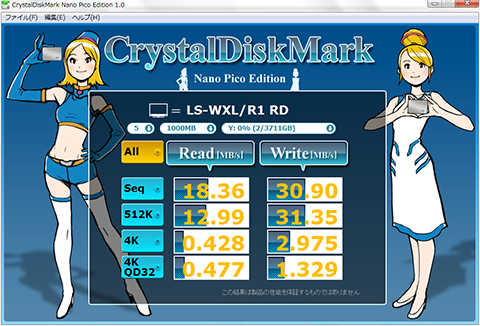 RAID無しのドライブ1台での数値です。LS-WXLに取り付けたいたときより良いパフォーマンスが出ていますので、こちらのNASで使用するのが良いようです。