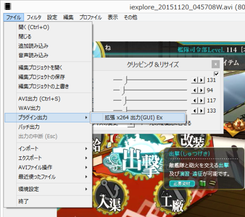 「艦これ」の場合、サイズは800x480ですが、YouTubeで使うプレイヤーのアスペクト比が16:9で480pは854x480なので、800x480でアップロードすると左右に黒い部分ができます。※動画1 再生環境によってずれたりしそうなので、左右を少し残して854x480でクリッピングした方が無難かもしれません。※動画2 また必要のない部分をなくしたい場合は800x480でクリッピング&リサイズを行い、[設定>サイズ変更>指定サイズ]で854x480の動画にすると少し横に引き伸ばされますが、必要のない部分がなくなります。※動画3