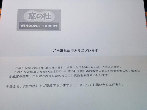 で、3度目の正直ならぬ3年目の正直なのか2013年の窓の杜大賞で読者プレゼントに