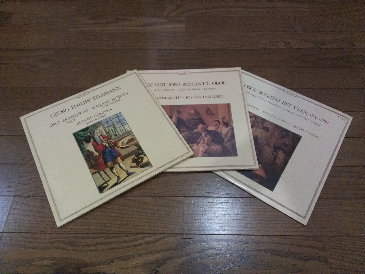 SEONレーベルで古楽器にはまり、バロックオーボエの音に何故か魅せられ、その後出てきたACCENTレーベルのポール・ドンブレヒト(バロックオーボエ)のレコードを3枚購入したようです。写真左から2枚は輸入版、右端は日本版です。