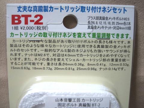 一般的に使用されるアルミ製のネジは強度が低く音質上もデメリットが多いようです。BT-2はそのような場合に使用できる真鍮製のボルトとナットのセットです。ボルトは長さが7種類それぞれ2本づつと対辺4mmのナットが10個セットになっています。これらの長めのネジを使用して別発売のWA-1と組み合わせてヘッドシェルとカートリッジを含めた重さを調整することも可能です。微調整にはナットの個数やボルトの長さを調整するとヘッドシェル部の重さを統一することが可能になり使いやすくなります。カートリッジとヘッドシェルの合計の重さを統一しておくとカーリッジ交換時に針圧調整の必要がなくなりカートリッジ交換がしやすくなります。BT-2に付属していますナットは対辺が4mmと小さくなっており、カートリッジボディーの溝部分にも無理なく使用することができます。