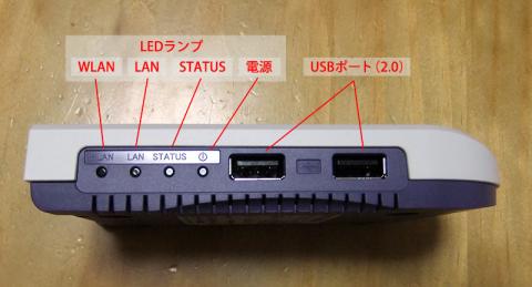 本体にはステータスを表すLEDランプ4つ、USB2.0ポートが2つ、電源ポート、