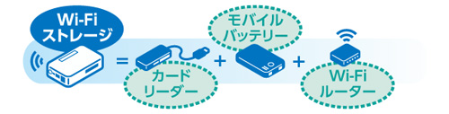 「使い方を見出した」という表現だと『Wi-Fiストレージ』が3つを合体した時に偶然生まれた付加価値というイメージを受けなくもないですが、おそらく本当のところはその逆で、Wi-Fiストレージを実現するために開発された製品と考えたほうが自然でしょう。