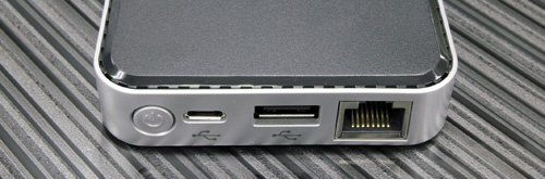 短辺側には左から電源スイッチ、USBポート(microB)、USBポート(A)、インターネットポートがあります。