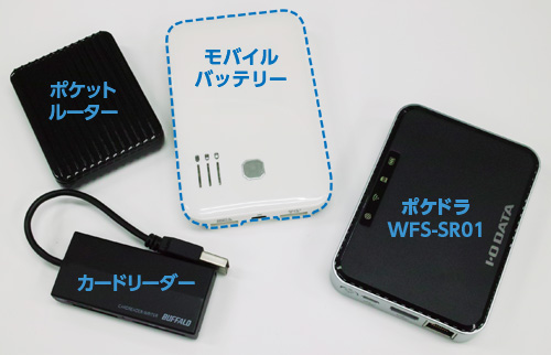 I-O DATA『WFS-SR01(ポケドラ)』は、モバイルバッテリーとポケットルーターの機能を内蔵したSDカードリーダーです。スマートフォン(以下スマホ)やタブレットといったモバイル端末の外部ストレージとして使用でき、予備バッテリーとしても利用できます。さらに出張や旅行先のホテルの部屋などに用意されているインターネット回線を共有することができる便利な製品です。