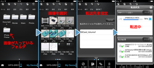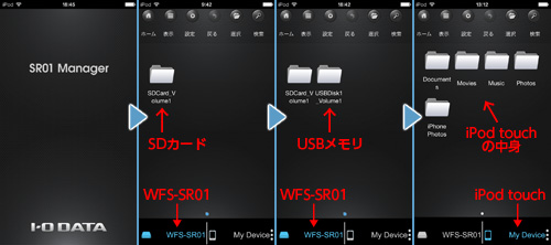 2.画面最下部の「青い表示」になっているのが現在選択されているデバイスです。「WFS-SR01」が選択されている場合は、本製品にセットしているSDカードや繋いでいる外部ストレージの中身を見ることができます。もう一方の「My Device」を選択すると、iPod touchの中に保存されているデータを見ることが出来ます。