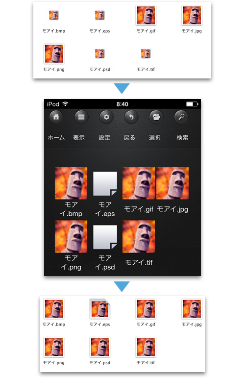 試しに同じ画像を何種類か違う形式で保存して、それらを本製品からiPod touchに転送してみました。