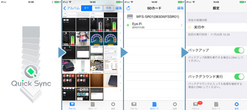iOSのAppStoreで「SR01 Manager」を検索した時に「Quick Sync」というI-O DATA純正のアプリを見つけたので、事前にインストールしてありました。このアプリを使うとiPod touchで撮影した画像データを自動的に本製品に転送してくれるということでなので、うまく利用すれば「SR01 Manager」を使わなくてもiPod touchからEye-Fiカードへ一括して簡単に転送できるかも知れません。