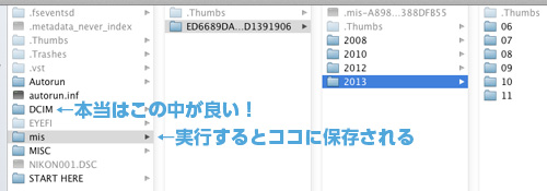 不思議に思ってEye-Fiカード内を調べてみると、Ey-Fiカード側で画像を保存するために使っている場所とは別の場所にデータが保存されていました。確かに「そりゃそうだ」と思い、フォルダのショートカット(エイリアス)を作ったりしてみましたが、どうやらiOSやEye-Fiカード内ではこれらを認識できないようで、残念ながら今回の目論みは失敗に終わりました。。。