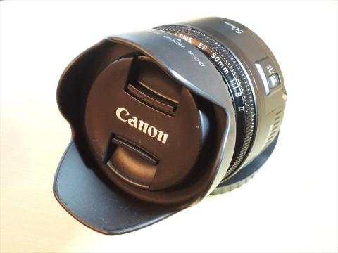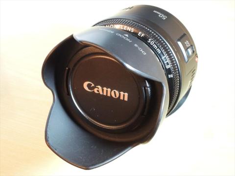 わたしは、キヤノンのレンズにニコンのキャップを着けることに抵抗を感じ、写真の50mm F1.8II用に花形フードを購入した時には、キャップ付きのセット品で購入しました。