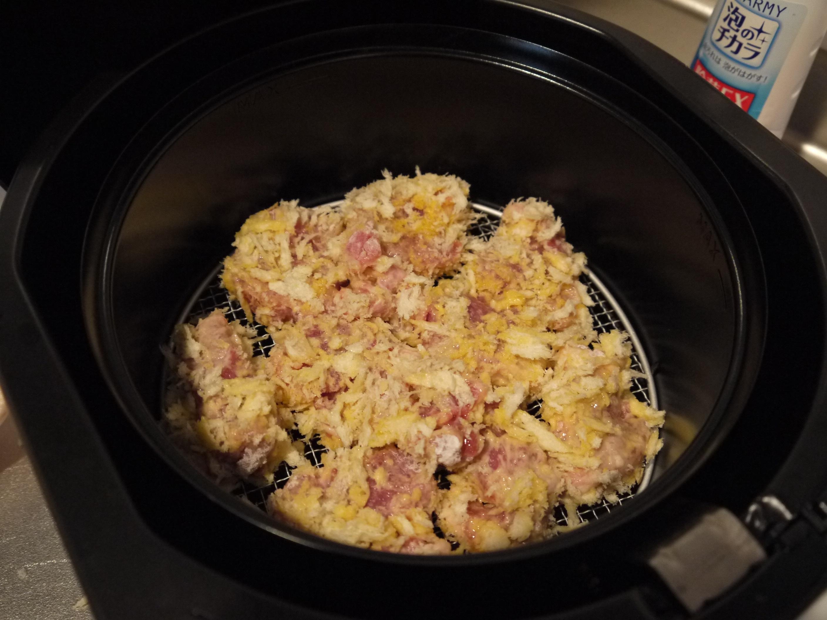生パン粉を使用、オイルスプレーをかけて揚げます。