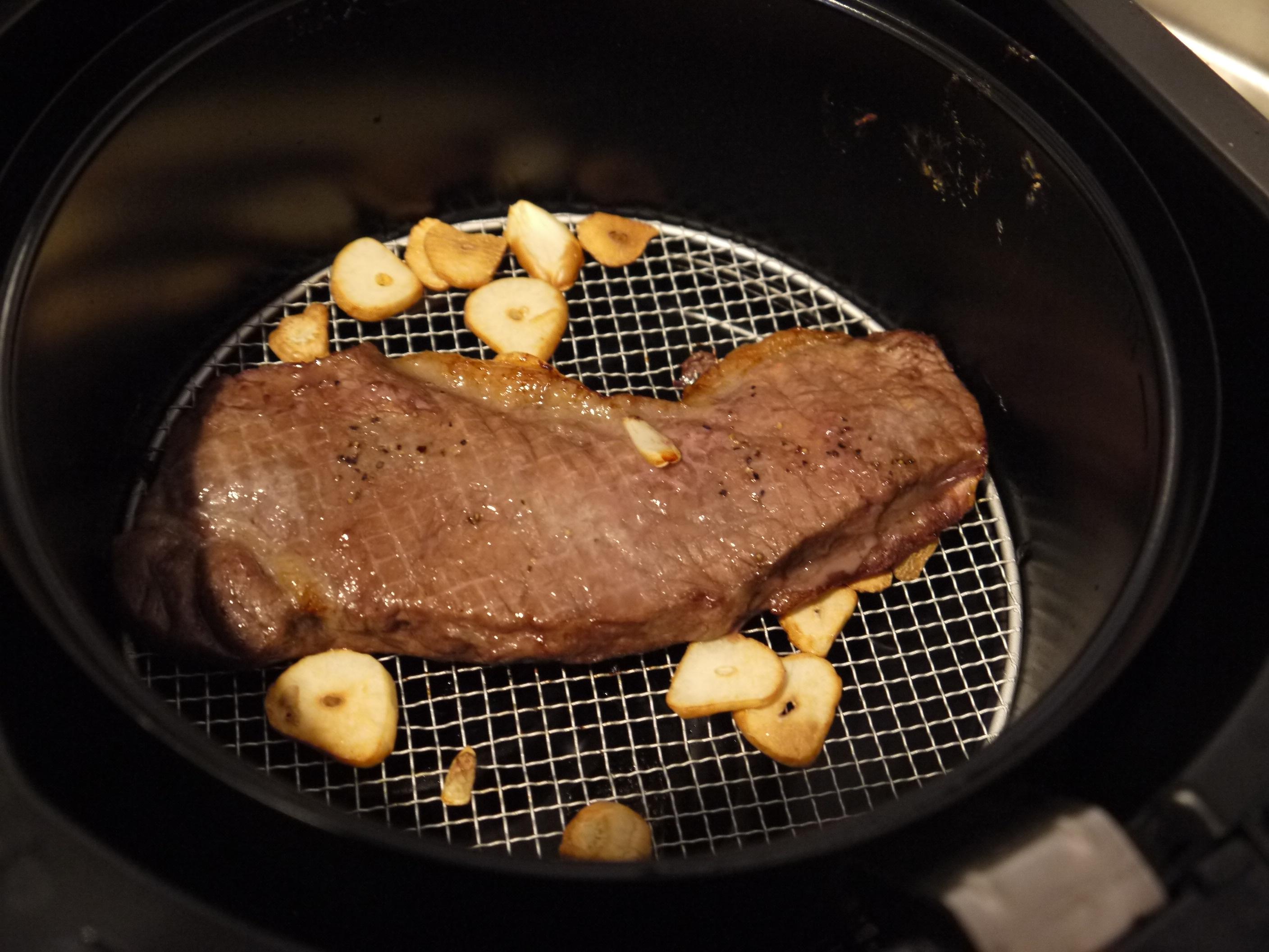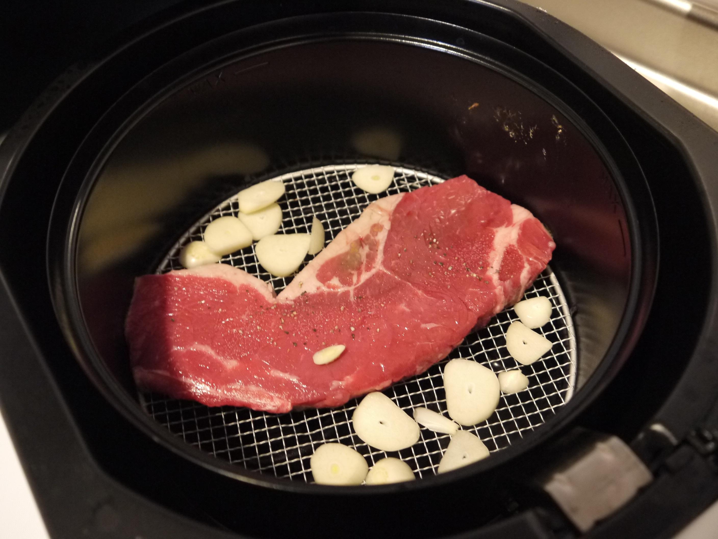 私はステーキはウェルダンが好きなんですが、フライパンだと焦げがひどくなったり、中が思った通りに焼けなかったりしたので、フライヤーにかけてみました。