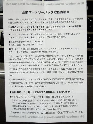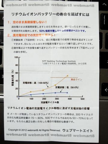 内容的にも、はじめの2~3回は使いきった方がいいことや、寿命を伸ばすための使い方が記載されており、 純正品よりも親切に感じるくらいだが、充電を50%程度にとどめるというのも難しいね・・・
