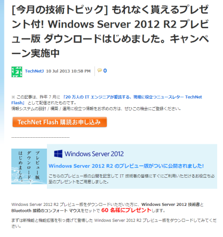 職場でRDS/VDI関連の検証をする際に見つけたキャンペーンで、WindowsServer 2012R2Preview版をダウンロードするだけで応募できるキャンペーンをやっていたので、応募していました。
