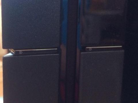 背面側は位置を揃えましたので、PS4の方が奥行きがあるのがわかります。突き出てしまうのは、意匠上仕方ない気もしますね。立てた時の高さは5cmくらい低くなり、厚みは45%ほど薄くなっています。