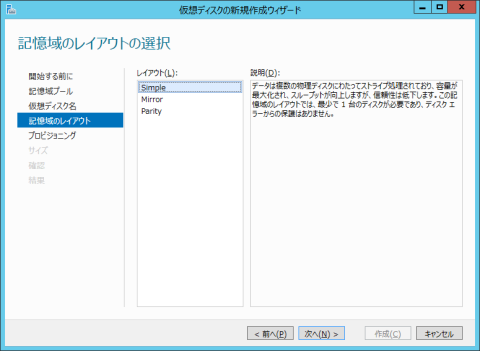 記憶域のレイアウトを選択します。Simpleを選択します。