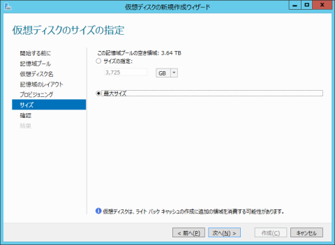 画面に従い、ボリュームのサイズを指定し、ドライブ文字を割り当て、