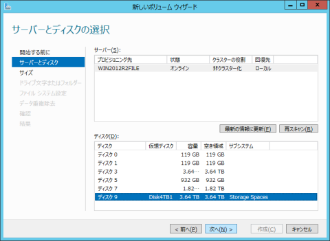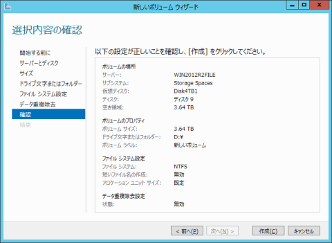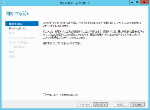 ・サーバーマネージャーの「ボリューム・記憶域プール」を使ってボリュームの作成を行います。