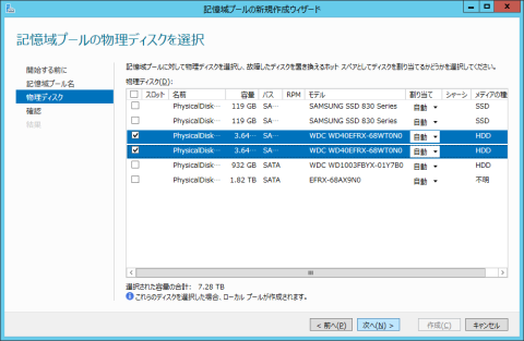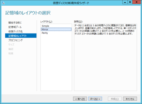 記憶域のレイアウトを選択します。mirrorを選択します。