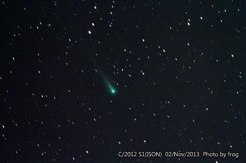 肉眼では見えませんが工夫をすると写真に撮ることができます。所謂天体写真という代物です。まだ暗い彗星ですから写りにくく、撮影した画像をPC上でいろいろと処理をしてあげないと人に見せられる写真にならないのです。この画像処理がCPUパワーを必要とするので高性能なPCが欲しくなります。11月2日に撮影したアイソン彗星の姿がこちらです。肉眼で見える素晴らしい尾を引いたアイソン彗星の姿が待ち遠しいです。