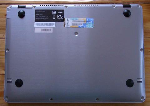 裏面をみるとバッテリーやメモリスロットへのアクセスは簡単にはでき無さそうです。特にバッテリーは予備を持ち歩いて、なくなったら交換するということは想定されていません。内蔵バッテリーでの稼働時間がカタログ値6.5時間ということですから軽い外出ならばACアダプターを持ち歩くことはないかもしれません。ただ、ビジネス用途を謳うのならばもう少し大容量のバッテリーでもよかったのではないかなとは思います。質量、価格、デザイン等との総合的な判断となりますのでバッテリーだけを交換すればよいというものではないでしょうから難しいところですが、個人的には10時間以上もって欲しいところです。しかしこの件に関しては実際に使用してから述べようと思います。