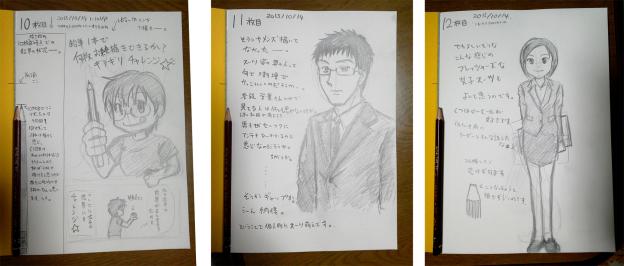 最初は消しゴムの使用はしないと決めていたのですが、いかんせん画力不足で見苦しくなりましたので、消しゴムは極力使わないと規制は緩和いたしました。チャレンジ番外編の募集が発表されてから、当落関係なしに描き始めました。もし落選していたらそのままどこかでアップすればいいやと思ってたので、当選発表があるまでマイペースに描いてました。21枚目が書き終わった後に、鉛筆の芯を削ったところ、中の方で芯が折れておりました。画像のようにセロテープで固定して使用しましたが、全体で5回ほど中で折れてしまっておりました。