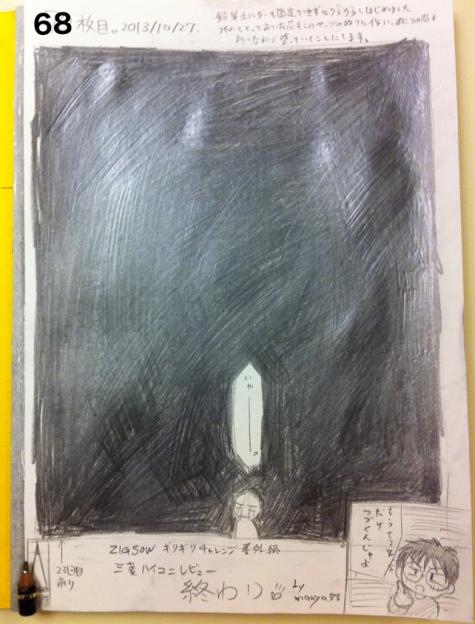 66枚目を描いた時点でもうあと2枚ほどしか主線は引けなさそうなのがわかっていたので、残りの芯はベタ代わりに使おうと思っておりました。