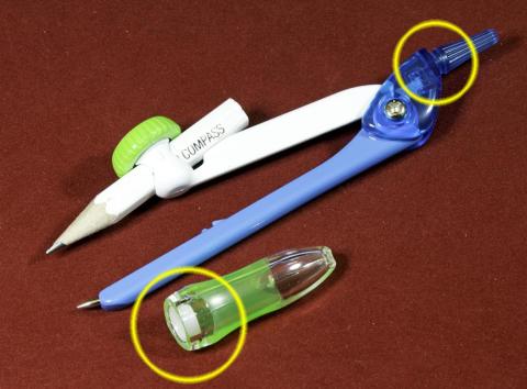 この他にも脚を開いた時に針が垂直になるように斜めに付いていたり、鉛筆を固定するネジが小さい力でしっかり締まるように大型のネジを採用したりしていますが、最近の子供用のコンパスでは定番の仕様のようです。