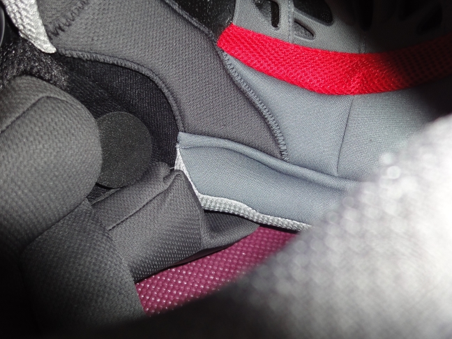 左右のスピーカーを繋ぐケーブルは、ヘルメットの内装に押し込んでいます。