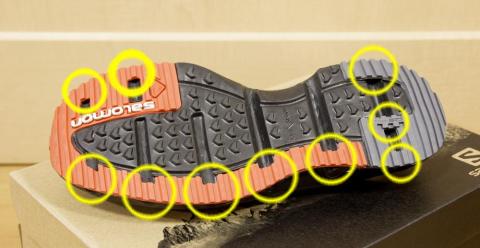 少し気になったのは、ソールのデザインで丸く囲ってる部分は中ほどから続くミゾに被せるように張り付いており、横から見ると空洞が出来ています。