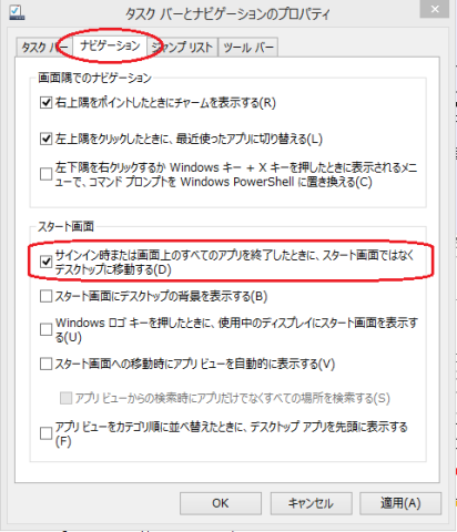 タスクバー→プロパティ→ナビゲーション から、サインインした(起動)後、あるいはアプリを終了したと、スタート画面ではなく、デスクトップに移るように設定できるようになった。このナビゲーションタブはWindows 8.1に追加された機能だ。